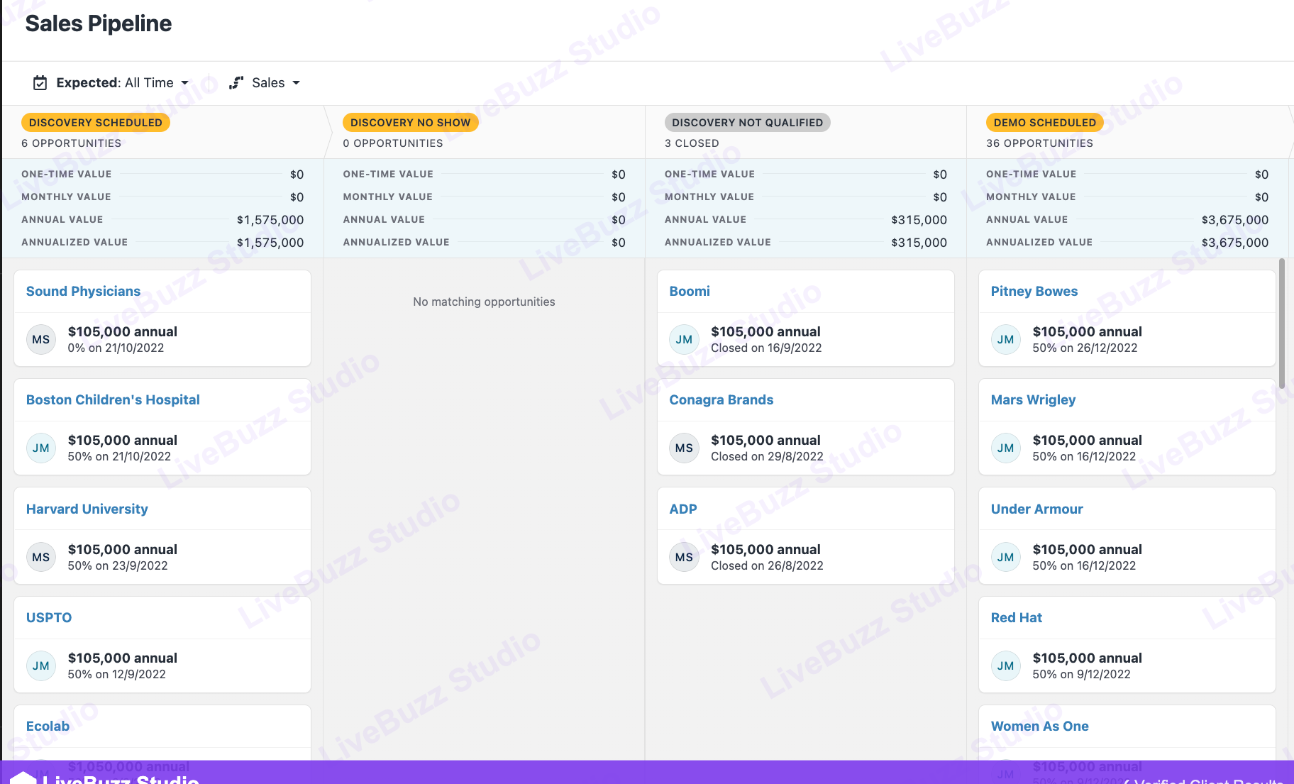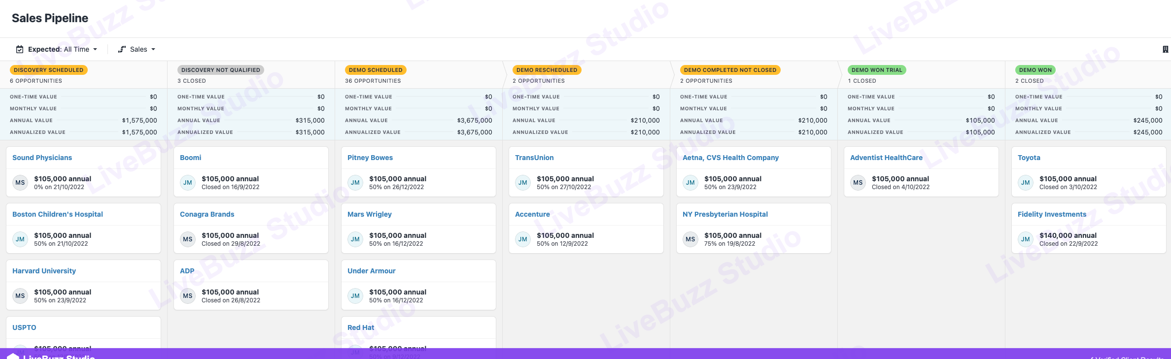 Pipeline included discovery-scheduled meetings with: Sound Physicians, Boston Children’s Hospital, Harvard University, USPTO, Ecolab, Pitney Bowes, Mars Wrigley, Under Armour, Red Hat, Accenture, Toyota, Fidelity Investments — all at $105K annual contract value or above.