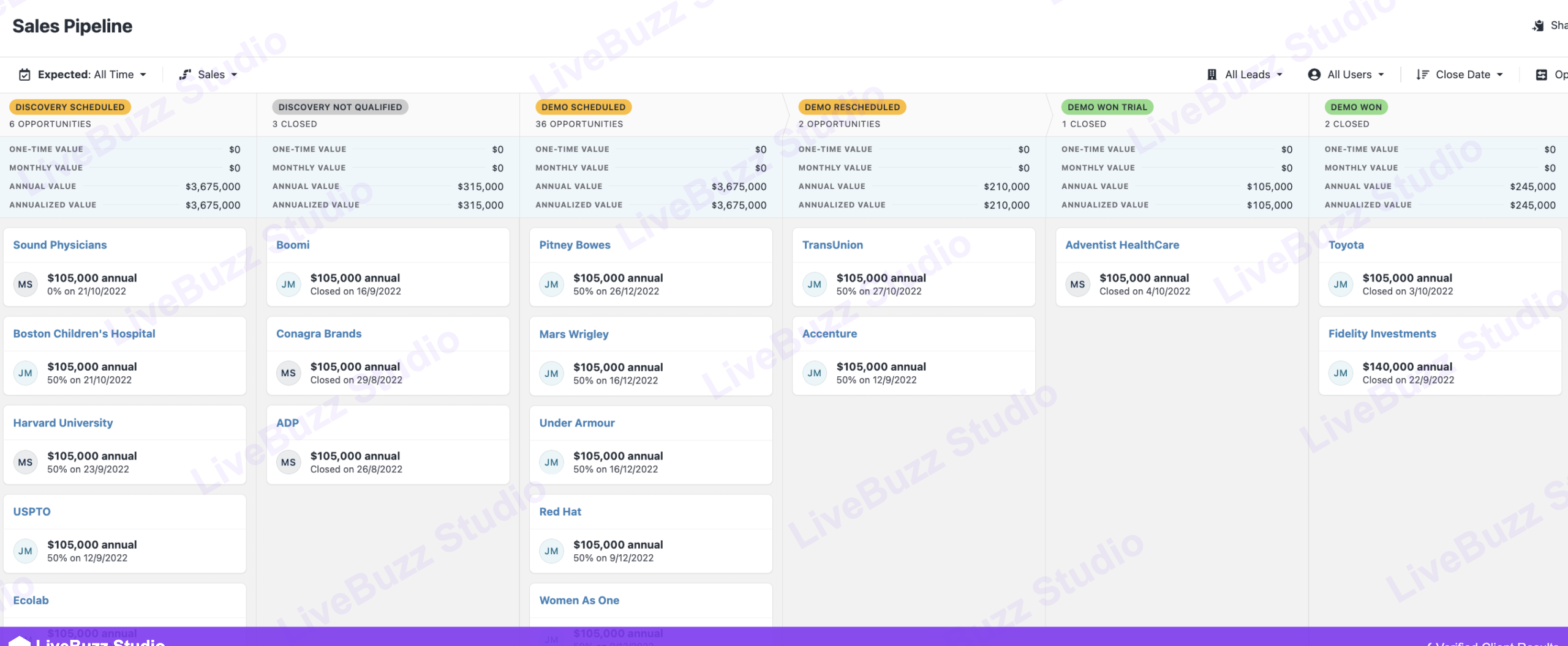 Kanban full view — Discovery Scheduled, Demo Scheduled columns with client names